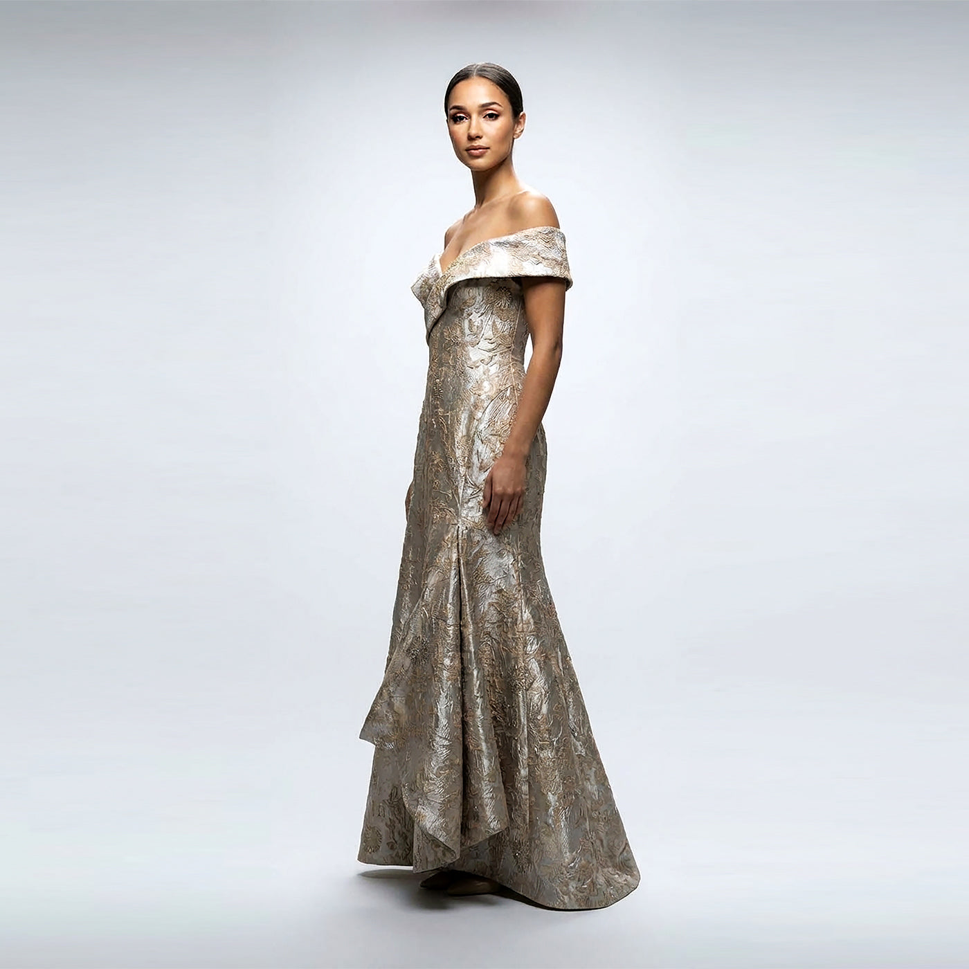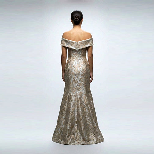 Crafted from luxurious champagne brocade, this off-the-shoulder asymmetric flounce gown embodies refined elegance. The structured built-in bustier provides graceful support and a flattering silhouette, while the dramatic flounce detail adds movement and dimension. Meticulously made in New York City, this statement piece is available in an array of sophisticated fabrications and colors to suit your vision. Perfect for galas, formal events, and unforgettable evenings.