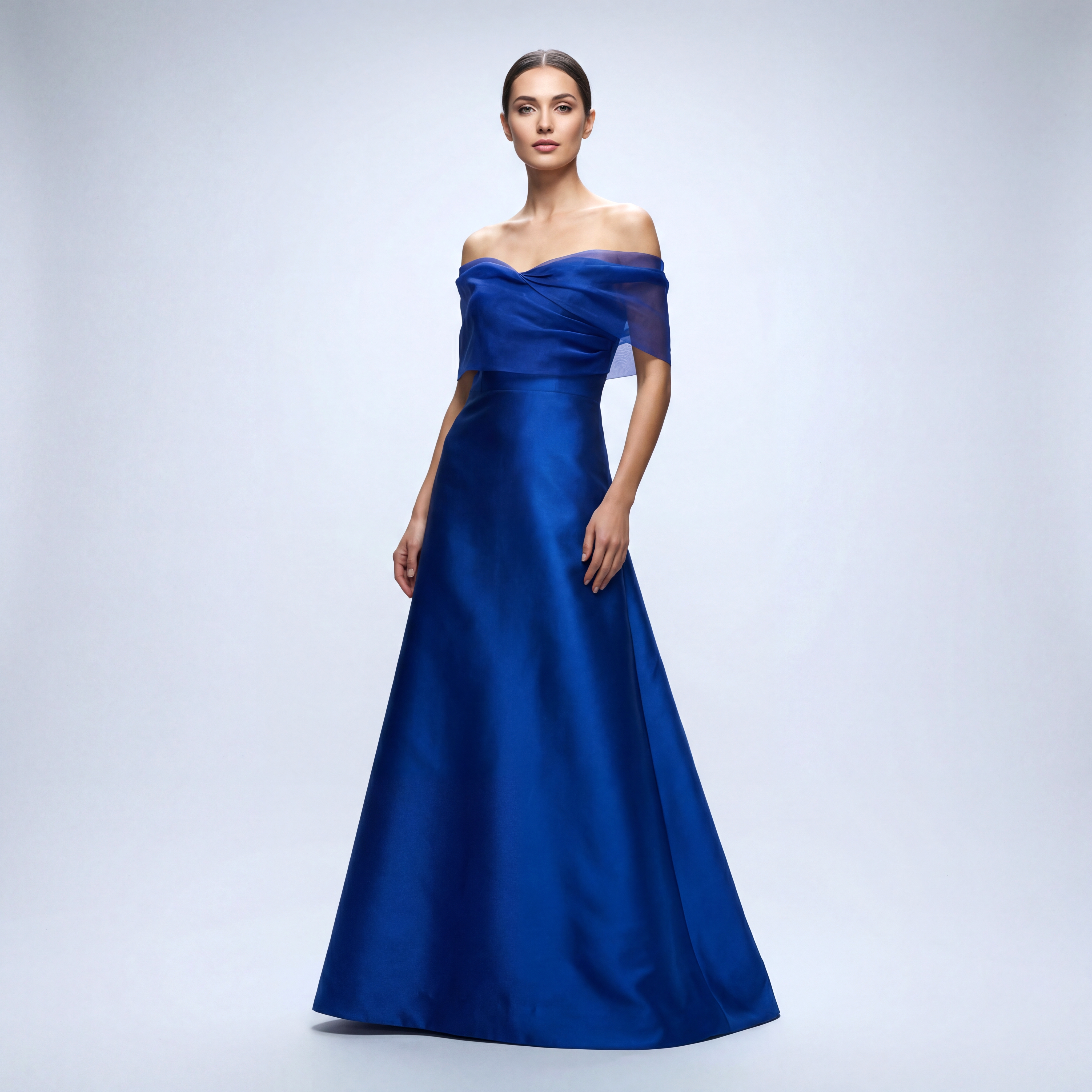 Make an indelible impression in the Vivienne Gown, an exquisite symphony of hue and fabric. Enveloped in a vivid, electrifying royal blue, this floor-length evening gown artfully melds a meticulously structured, lustrous silk blend mikado skirt with a delicate, ethereal Silk Organza bodice.