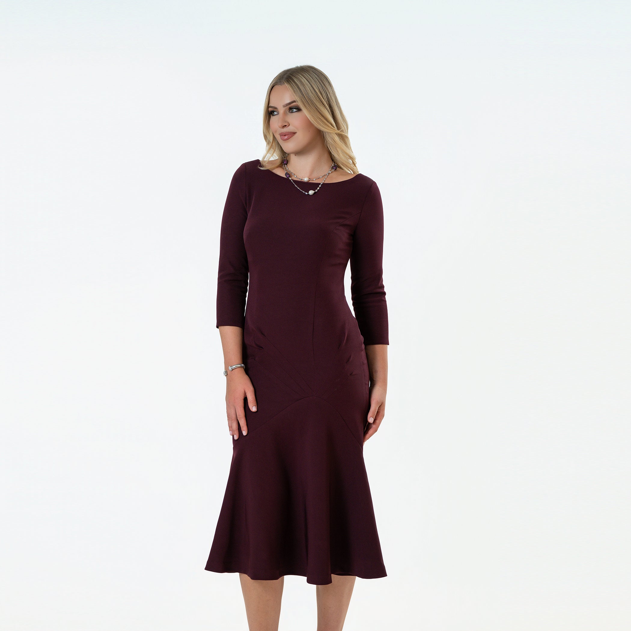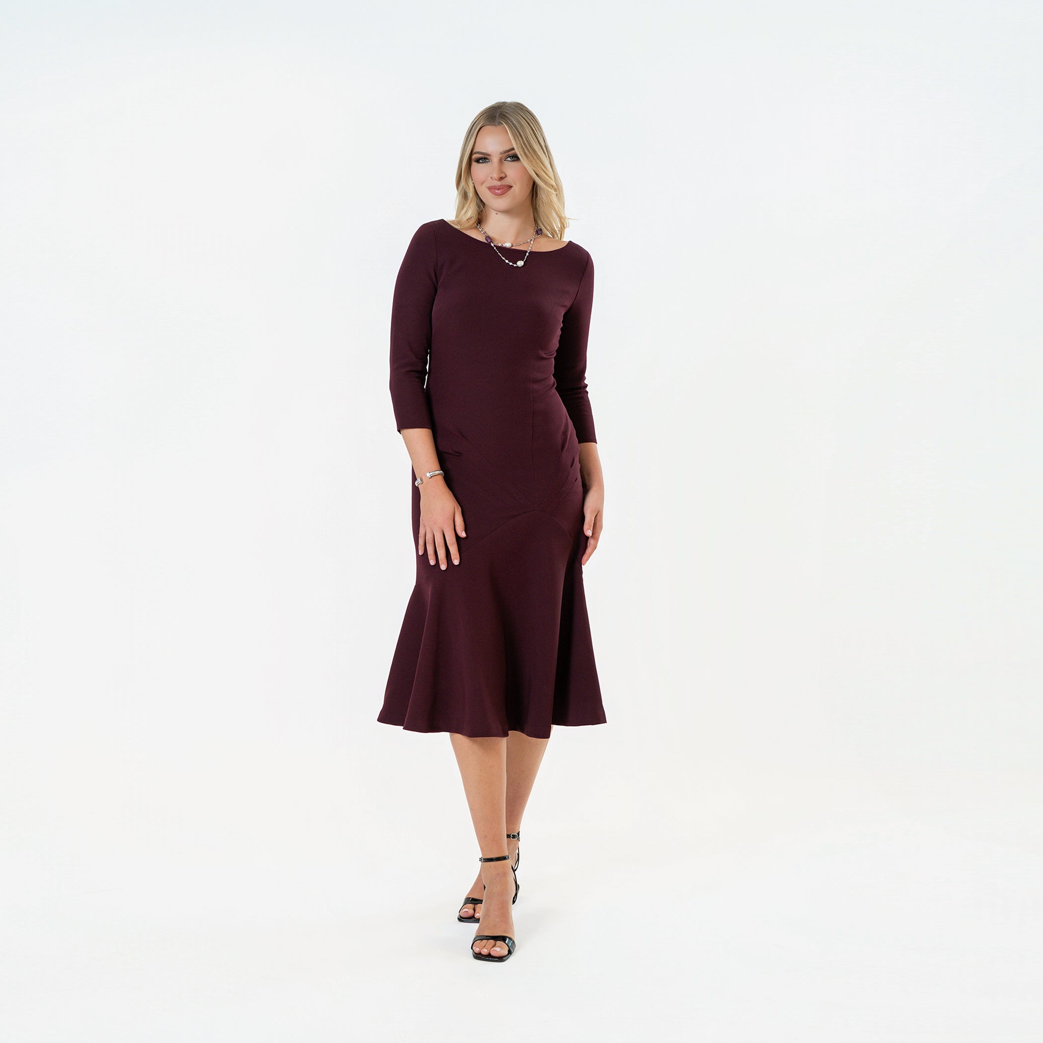 This sophisticated midi dress features a timeless boat neck and a flattering flounced silhouette, enhanced by delicate pintuck detailing. Its elegant design makes it an ideal choice for cocktail events or a polished corporate look, seamlessly blending modern style with classic charm.