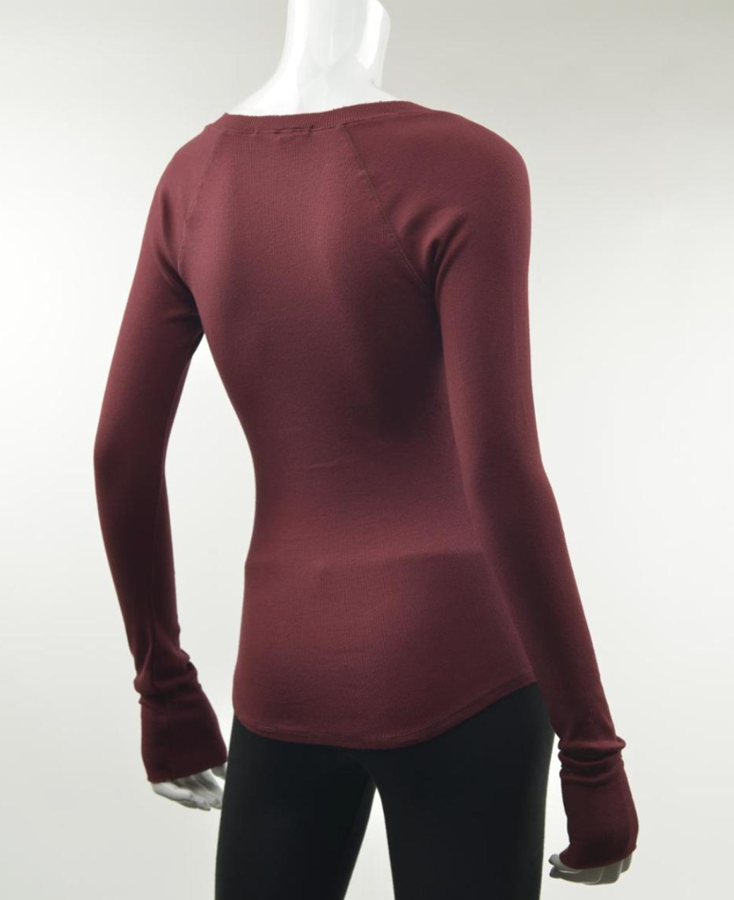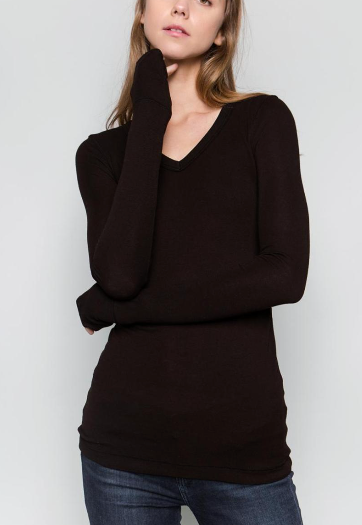 Classic Long Sleeve V-Neck. Made with our signature luxe knit and our proprietary DNA spandex for a natural stretch and great recovery . Sewn with reverse 5 thread stitches on binded V neck and all seams for extra strength. Perfect longer sleeve length with 3 inch raw edge cuffs will suit you well layered or not. Slightly rounded bottom hem and plenty long for your liking. Model is 5'9 wearing size small with 26" length. Enjoy year round.