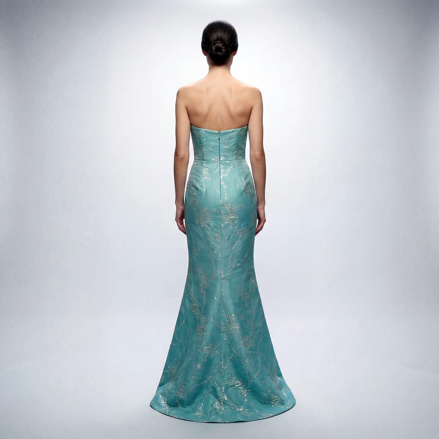 Elevate your next gala or formal event with a gown that captures the light and the room. This stunning strapless evening gown is crafted from premium aqua-blue brocade featuring delicate, metallic silver floral embroidery that winds gracefully across the silhouette.
