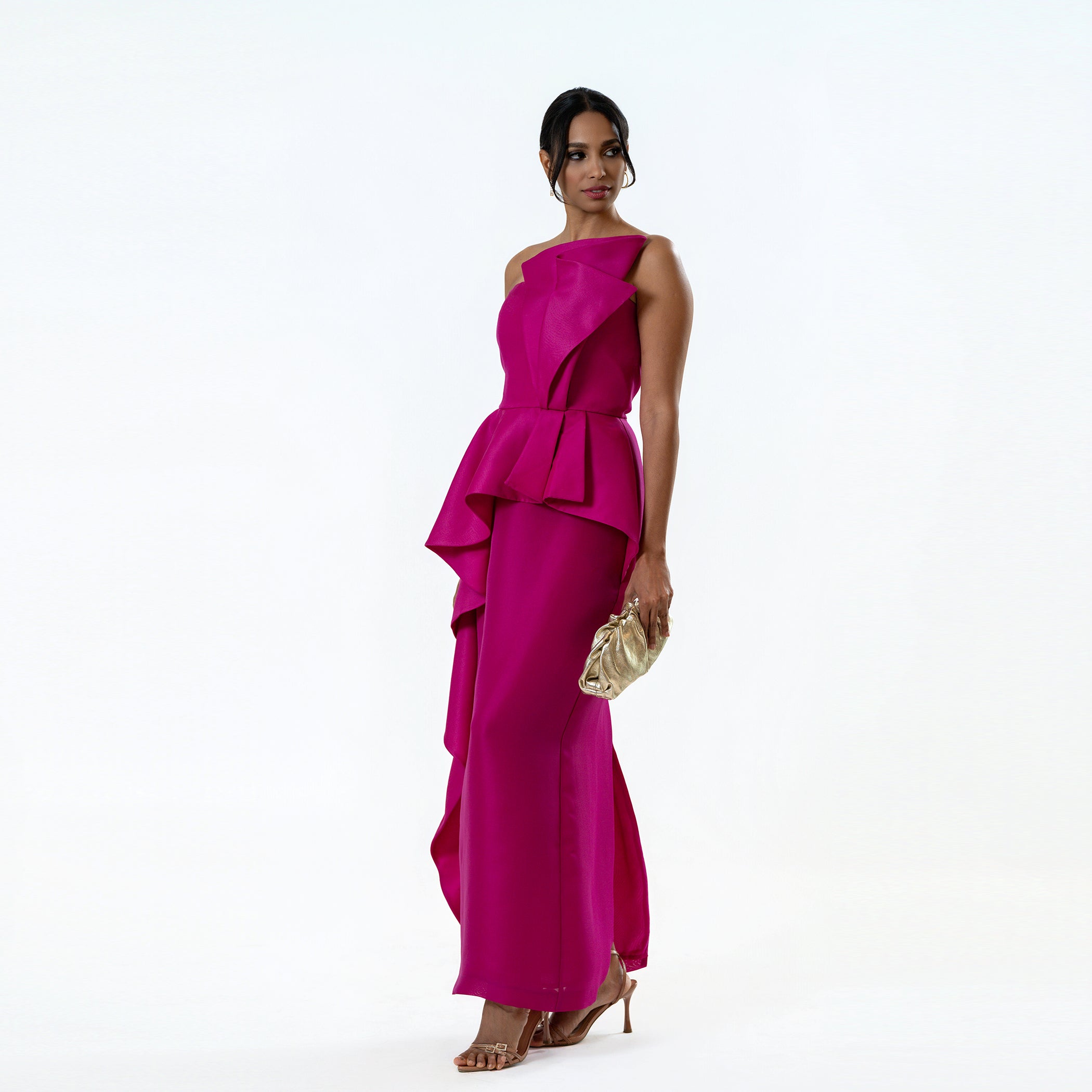 Crafted in the heart of New York City, this strapless gown exudes elegance with its asymmetric peplum flowing delicately along the side seam. The front bodice is adorned with an exquisite origami flower overlay, showcasing refined artistry.