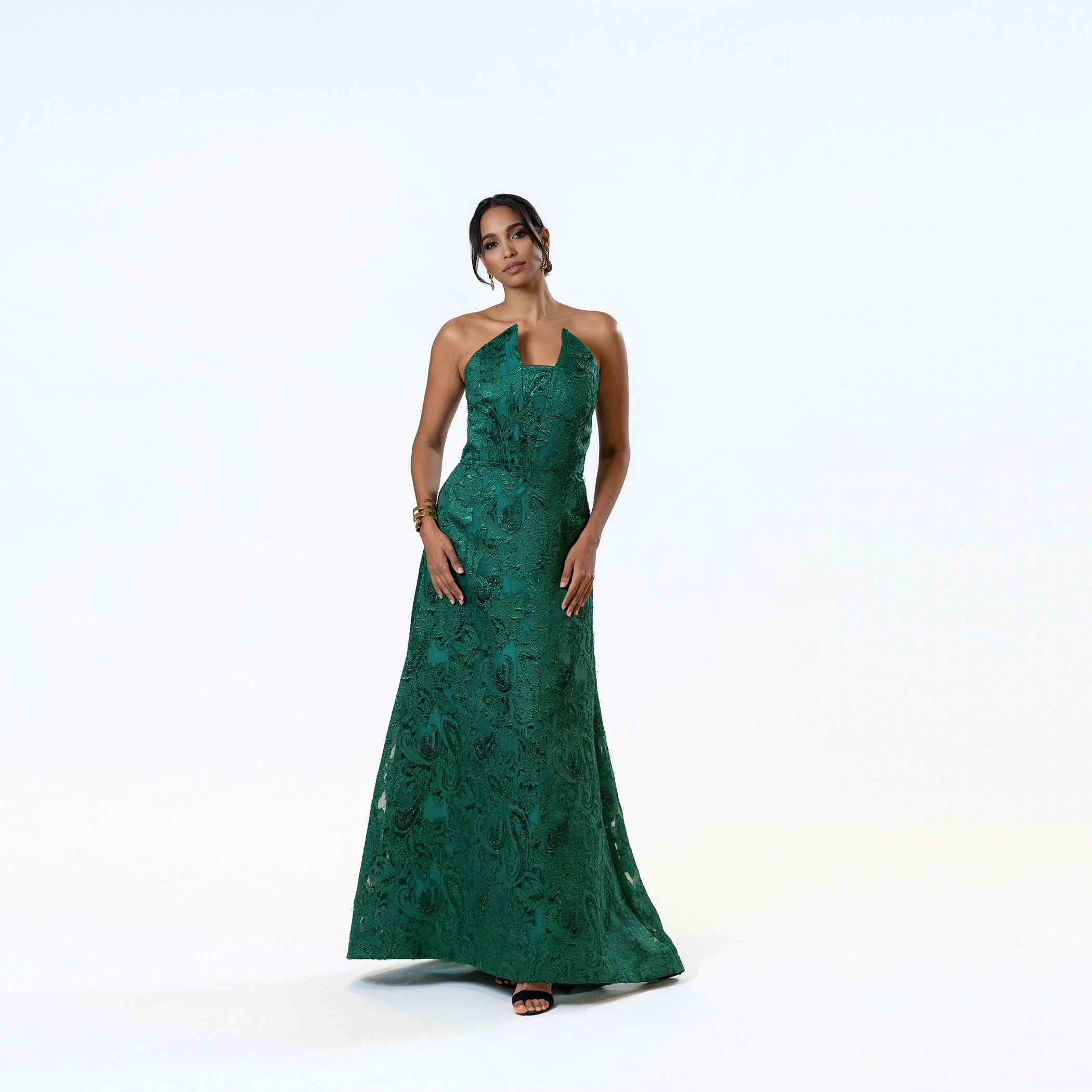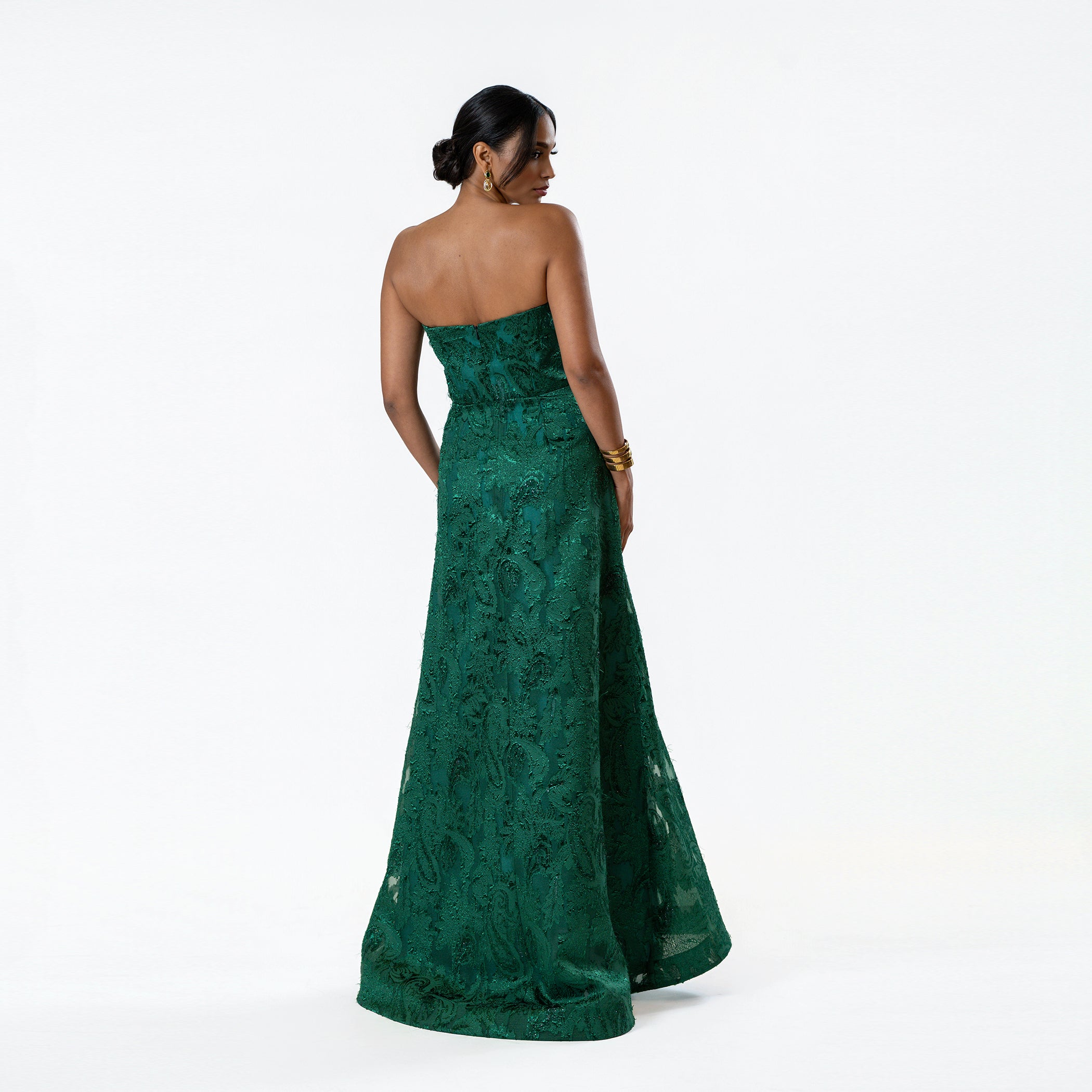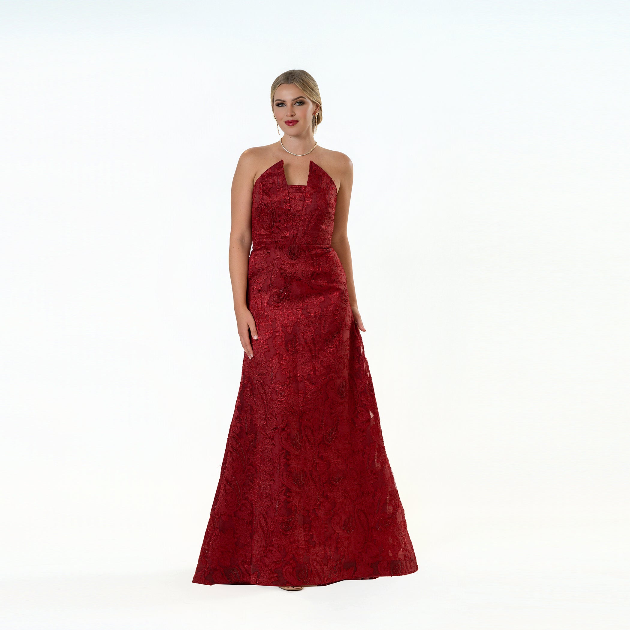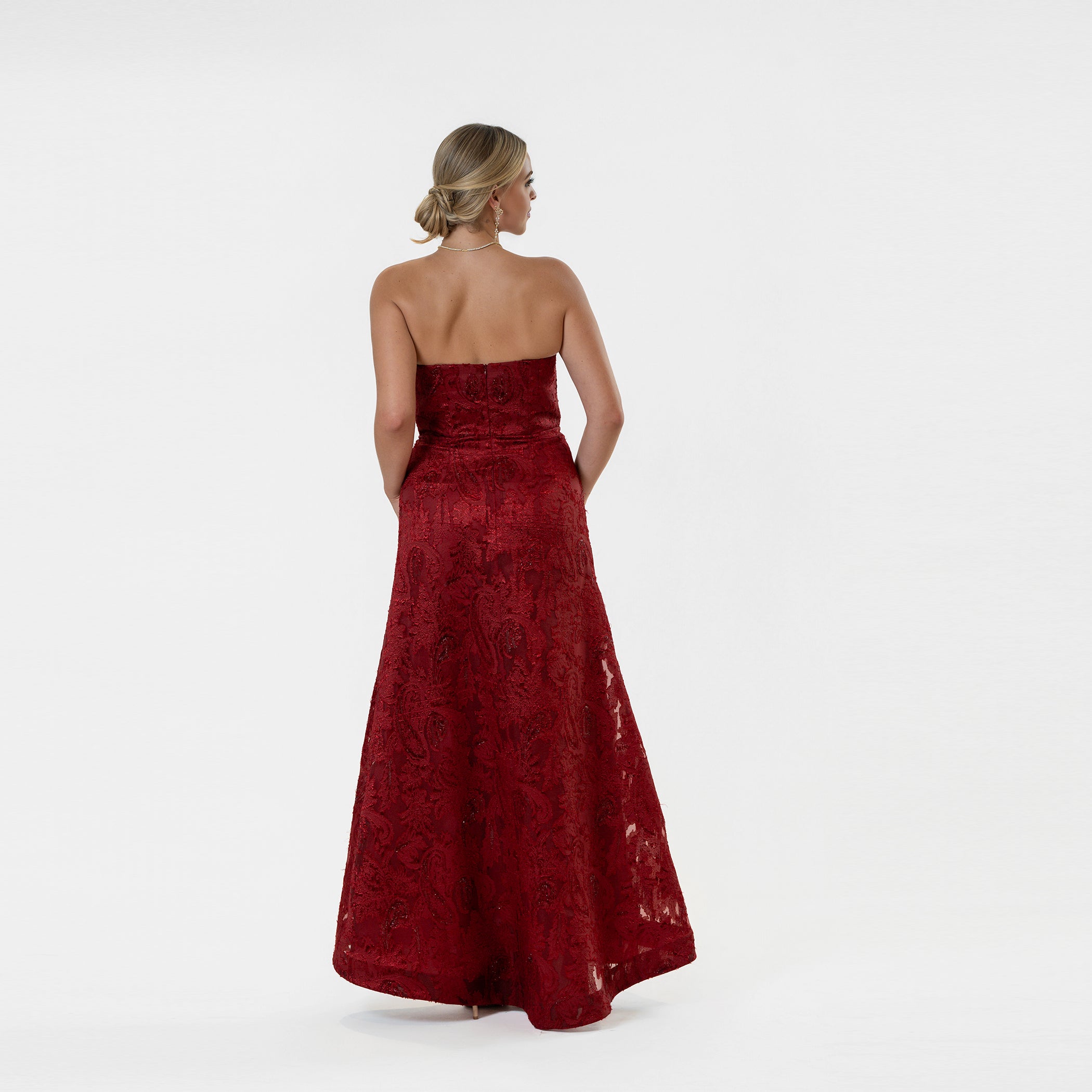 This sophisticated gown showcases a pointed strapless neckline that adds a subtle dramatic flair, paired with Cenia's iconic A-line skirt to enhance a range of body shapes. Made from exquisite paisley burnout novelty fabric, it includes an integrated bustier for added support, blending comfort with elegance.